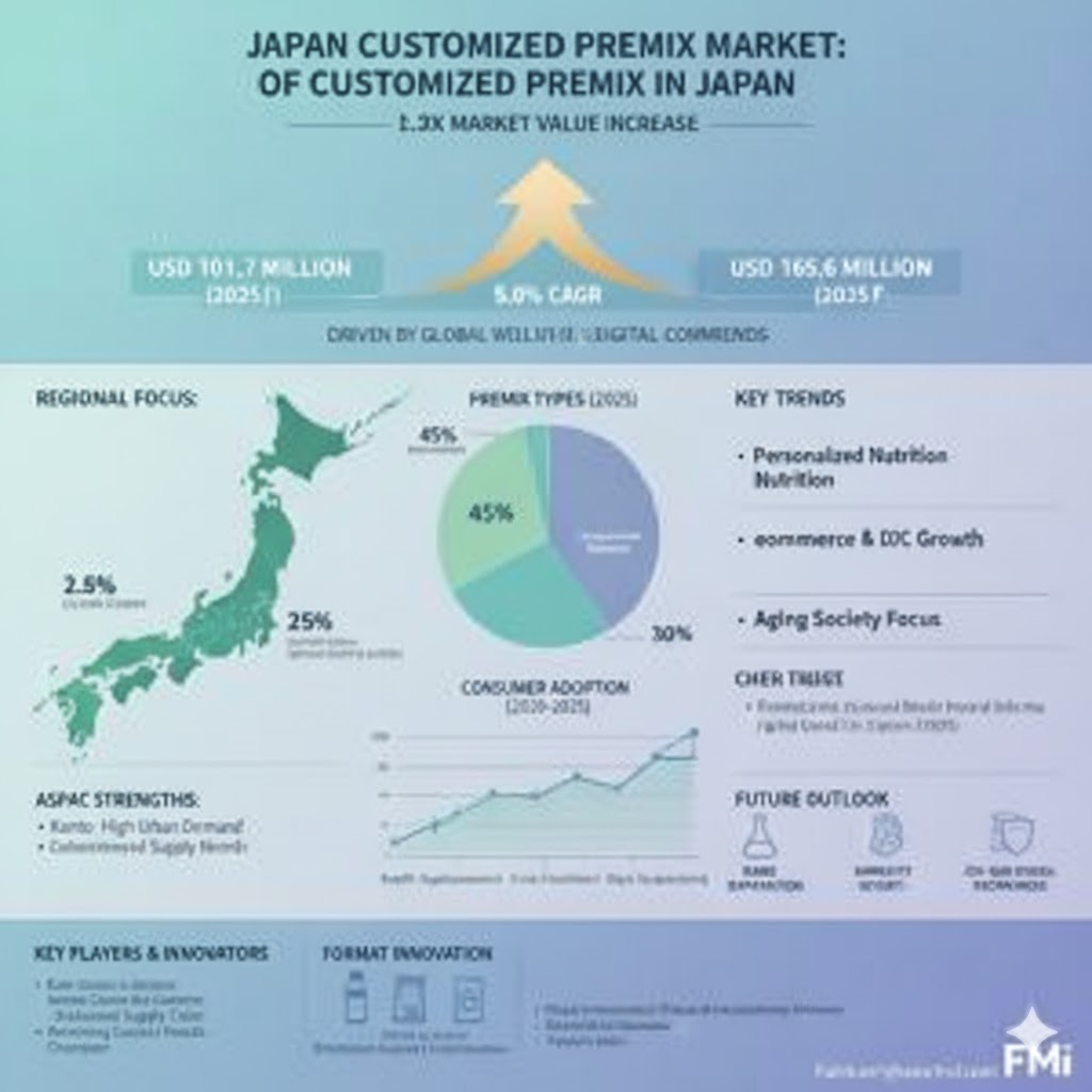 NEWARK, DE, UNITED STATES, October 10, 2025 /EINPresswire.com/ -- The Japan customized premix market is on a significant upward trajectory, projected to grow from an estimated USD 101.7 million in 2025 to USD 165.6 million by 2035, reflecting a robust compound annual growth rate (CAGR) of 5.0% over the forecast period. Europe-based companies and investors observing global trends in functional nutrition are increasingly looking to Japan’s dynamic landscape for collaboration, innovation, and strategic expansion.