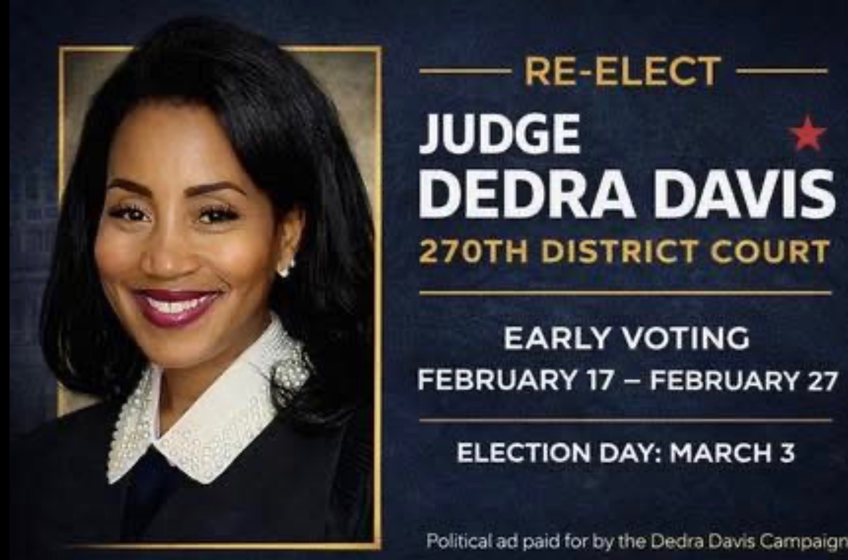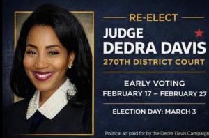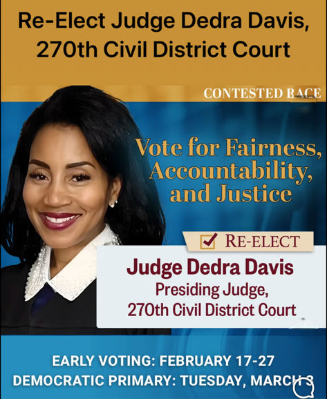 Judge Dedra Davis presides over the 270th District Court in Harris County, Texas. With 40 years of combined legal experience as a paralegal, attorney, and judge, she is dedicated to modernizing the court system and increasing access to justice. For more information, visit dedradavisforjudge.com.